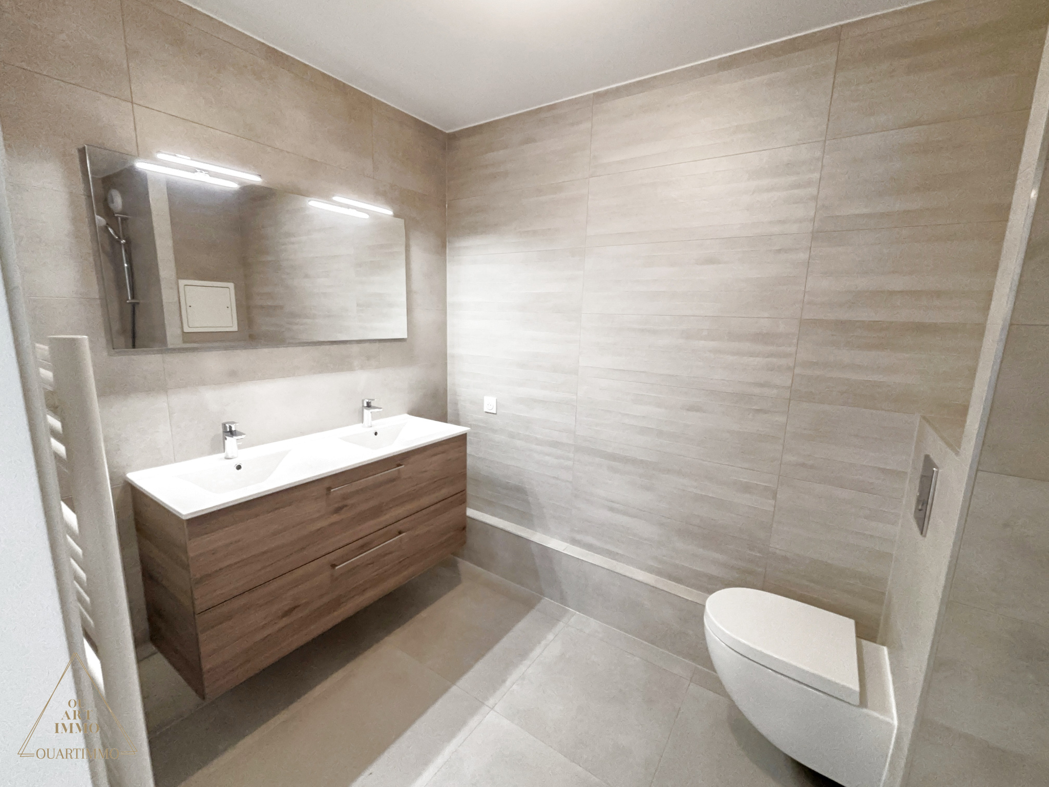 Une salle de bain indépendante avec baignoire, meuble double vasque et sèche serviette
