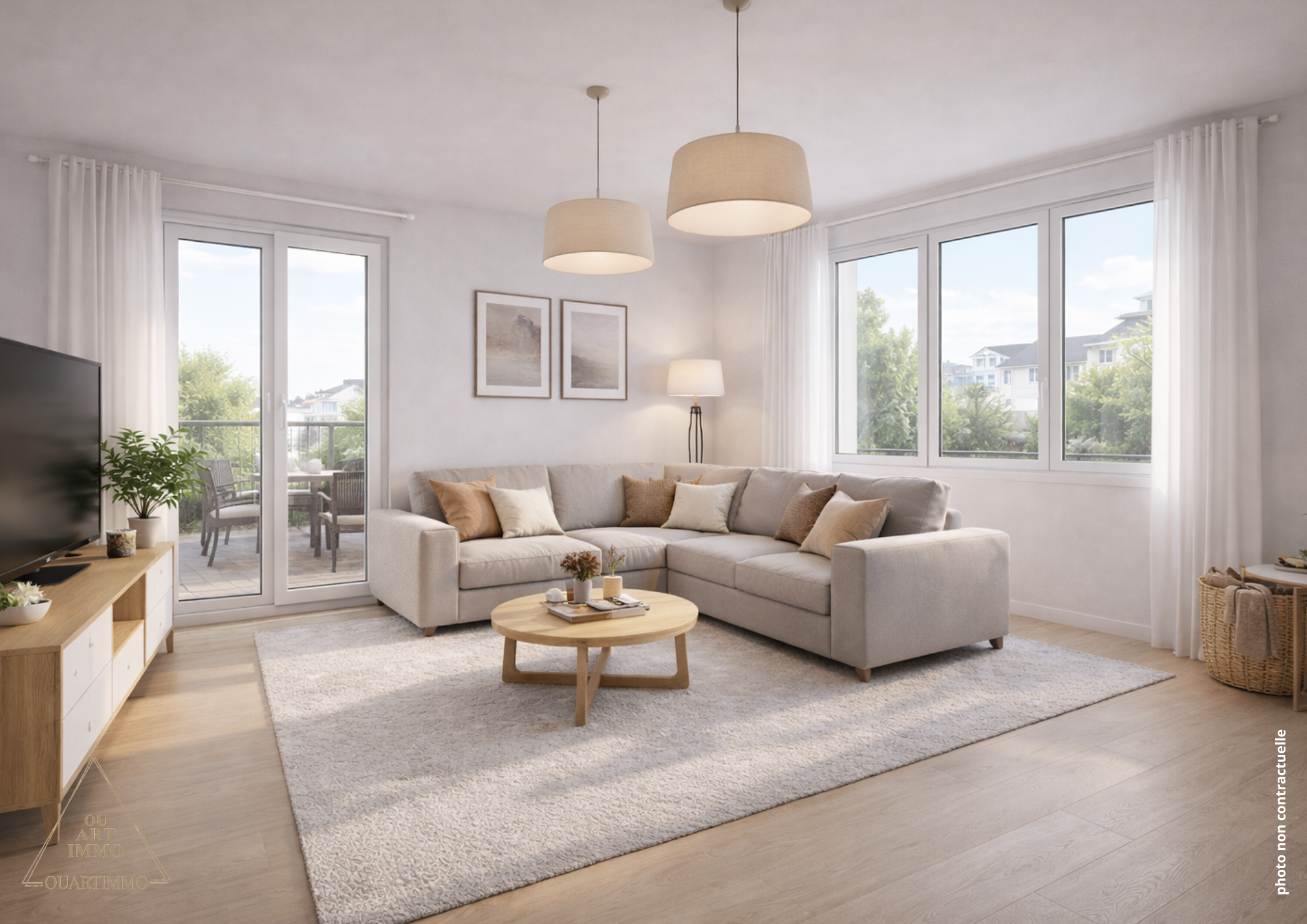Une pièce de vie lumineuse de 26,57 m² avec séjour et cuisine ouverte, offrant un espace convivial et fonctionnel, avec un accès direct à une terrasse de 9,09 m², idéale pour profiter des beaux jours.
